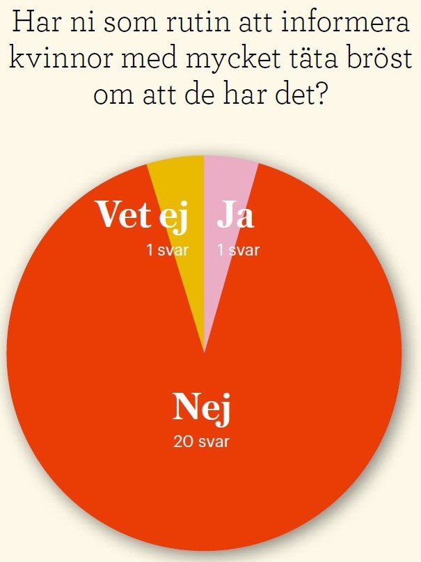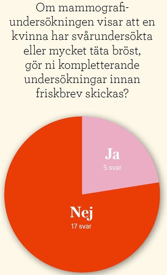 Övriga 17 svarar att svårundersökta bröst inte leder till att kvinnan erbjuds kompletterande undersökningar. Anledningen är att det inte ingår i Socialstyrelsens riktlinjer för bröstcancerscreeningen. Det är också den vanligaste motiveringen till att man inte informerar kvinnor med mycket täta bröst om att de har det. Nio av tio uppger att man inte gör detta, bland annat för att man anser att det skulle skapa mer oro än trygghet, eftersom dessa kvinnor ändå inte kan erbjudas tätare eller andra kontroller i dagsläget.